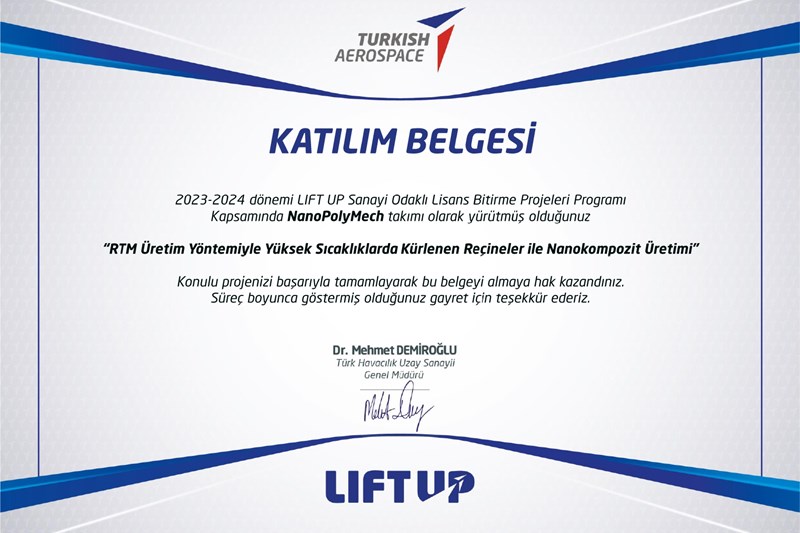 Bölümümüz öğrencilerinden Esra Kumaş, Dilek Korkmaz, İbrahim Ceylan ve Emir Özdemir (Takım Adı: NanoPolyMech), "RTM üretim yöntemiyle yüksek sıcaklıkta kürlenen reçineler ile nanokompozit üretimi" başlıklı TUSAŞ-Liftup projelerini başarıyla tamamladı.